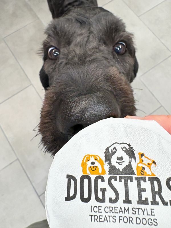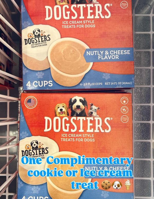 As a special treat, your pup will enjoy a complimentary Dogster Ice Cream or a Paw-treat Cookie.