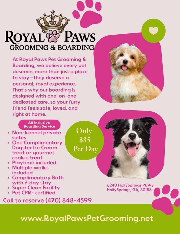 At Royal Paws Pet Grooming & Boarding, Our promise is to treat your pets like we treat our own -with patience, respect and love. We're here to build lasting relationships with pets and pet parents alike and to be your trusted partner in grooming and boarding care.